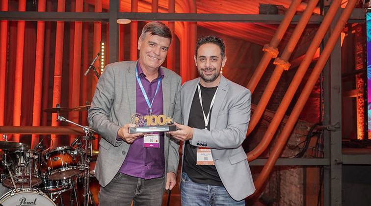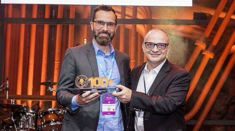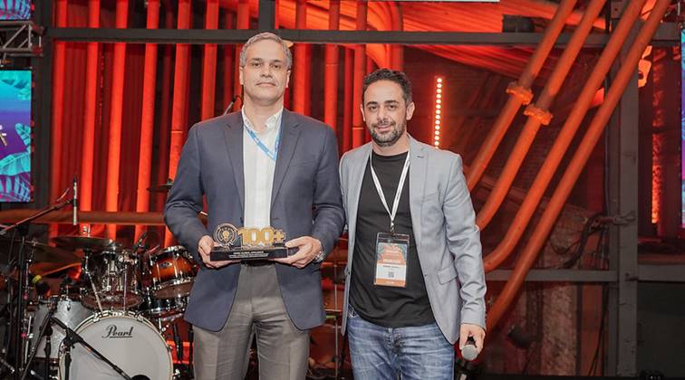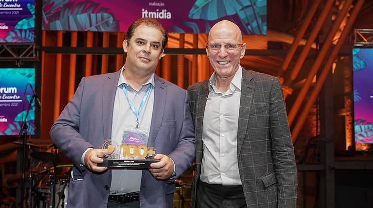 Paulo Henrique Scrideli, vice-presidente sênior de TI da Fleetcor/Sem Parar – vencedora da categoria Serviços Financeiros e do ranking geral das 100+ Inovadoras – ao lado de Miguel Petrilli, presidente do Conselho de Administração da IT Mídia