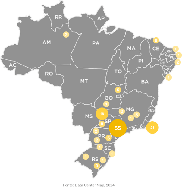 Segundo dados da Associação Brasileira de Data Centers (ABDC), o Brasil conta com 150 data centers operados por grandes provedores e empresas de telecomunicações, segundo o Data Center Map. A maior parte desses data centers está concentrada nas regiões Sudeste e Nordeste, com destaque para São Paulo e Fortaleza devido à importância estratégica dessas localidades para a interconexão de redes internacionais e a demanda de serviços digitais. Confira no mapa criado pelo IT Forum, com dados do Data Center Map 2024, quais são os mais expressivos e onde estão.