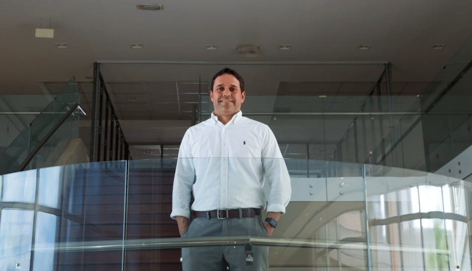 Homem de meia-idade com barba e cabelo curto, ambos grisalhos, usando óculos de armação preta e camisa social rosa clara. Ele está sorrindo levemente e olhando diretamente para a câmera. O fundo está desfocado, sugerindo um ambiente de escritório moderno e bem iluminado, com móveis e janelas visíveis de forma indistinta. CIO