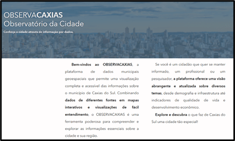 O resultado desse projeto foi apresentado e entregue no dia 6 de setembro de 2023 denominado Observa Caxias (Figura 1). Essa ferramenta é uma plataforma de dados municipais geoespaciais que permite uma visualização completa e acessível das informações sobre o município de Caxias do Sul. A plataforma permite a navegação sobre temas pertinentes ao plano de governo e as metas estabelecidas, bem como, consultar as informações dos indicadores relativos aos Objetivos de Desenvolvimento Sustentável (ODS).
