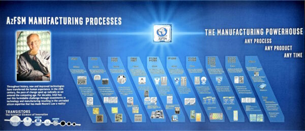 Enunciada em 1965, revisada em 1975, Gordon Moore previu que a quantidade de componentes dos circuitos integrados iria dobrar a cada dois anos. Essa afirmação foi ao mesmo tempo profética, precisa e também virou uma meta sendo perseguida pela Intel a cada ano ou dois anos. O processo de fabricação veio sendo alterado (litografia), reduzindo seu tamanho fazendo mais e mais componentes caberem em espaços cada vez menores. Lá na FAB 41 em Chandler, logo na entrada tem um painel fantástico que dá uma boa ideia dessa evolução, desde os 350 nm até 7 nm.