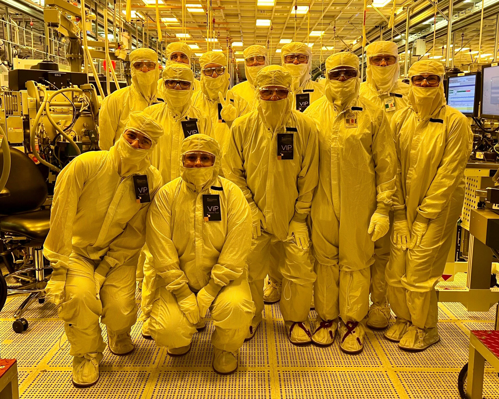 Nosso tour foi na Fab 42, já em larga operação há algum tempo ali em Ocotillo. Eu já sabia que o nível de limpeza e purificação do ar no ambiente de processamento dos waffers de silício era extremamente alto. Não é incomum ouvir e nem é exagero dizer que o grau de exigência é mais alto que o existente em uma UTI hospitalar! Foram pelo menos 20 minutos de preparação para poder entrar no ambiente fabril de fato. Proteção para o sapato, cabelo, barba, luvas pano, outra luva por cima, higienização dos crachás, etc.