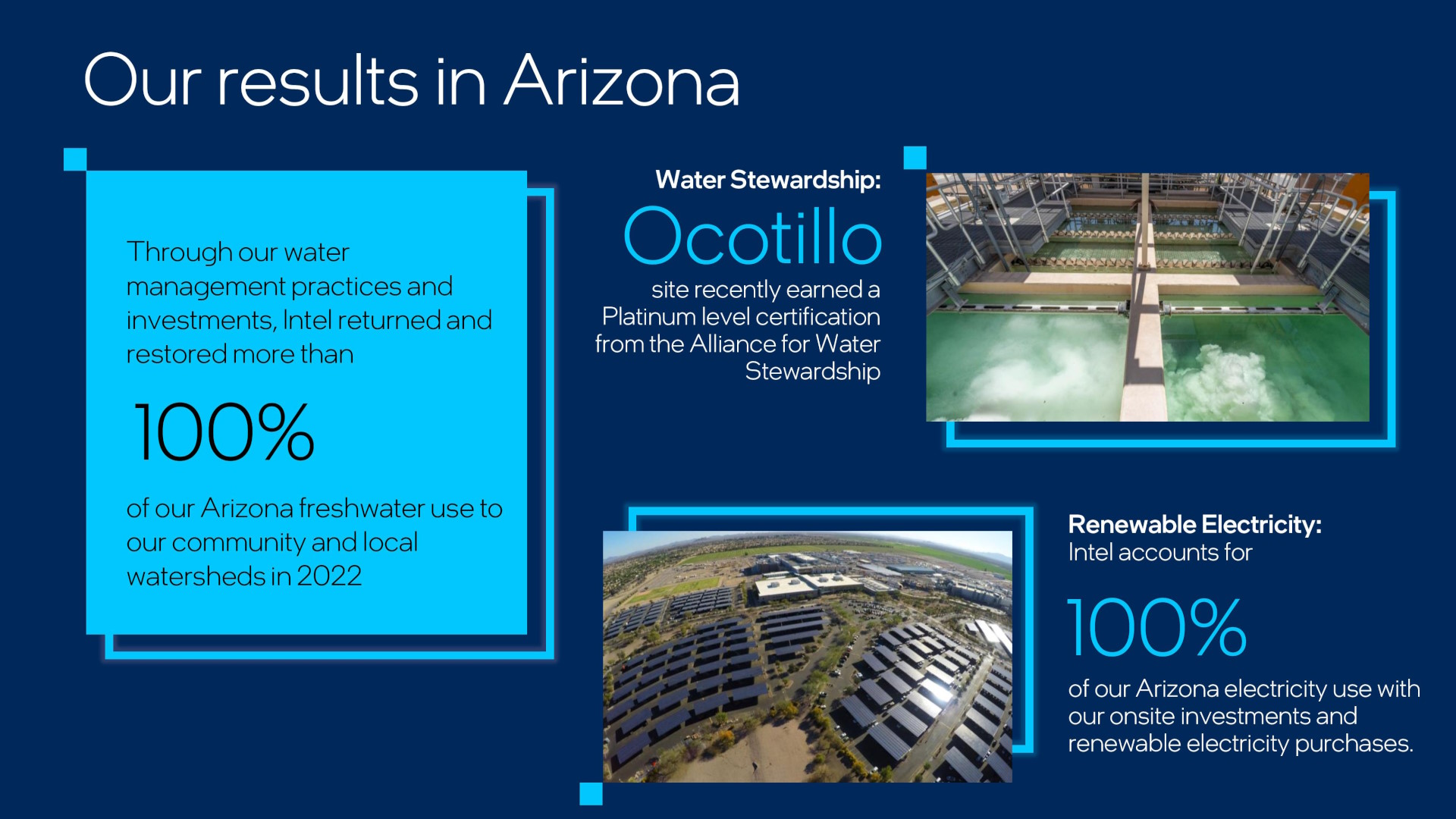 Em 2021, a Intel confirmou o compromisso com o Arizona ao anunciar um investimento adicional de US$ 20 bilhões. Esta iniciativa de expansão inclui a construção de duas fábricas de semicondutores de última geração no Campus de Ocotillo, elevando o investimento total da Intel no Arizona para mais de US$ 50 bilhões em mais de quatro décadas. As novas fábricas produzirão as tecnologias de processo mais avançadas da Intel, incluindo Intel 18A e Intel 20A com as novas inovações RibbonFET e PowerVia.