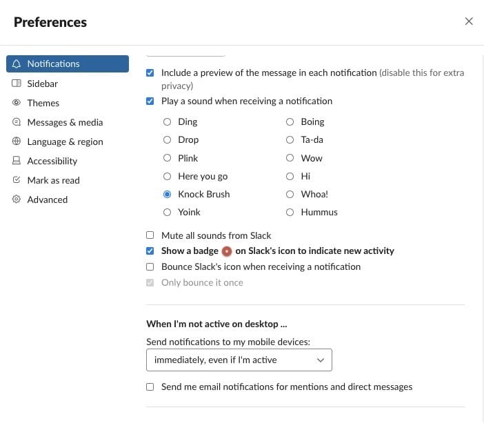 No aplicativo Slack da área de trabalho, clique no nome do seu espaço de trabalho. Escolha Preferências> Notificações. Vá até a parte inferior do menu. Em “Quando não estou ativo no desktop …”, escolha imediatamente, mesmo se eu estiver ativo.