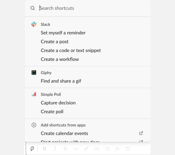 Os atalhos do Slack permitem que você acesse rapidamente tarefas frequentes, como iniciar uma chamada ou definir um lembrete para você mesmo. Eles também podem ser integrados com aplicativos de terceiros, como Doodle Bot, para encontrar rapidamente os horários disponíveis para se encontrar, ou Polly, para conduzir uma votação rápida de uma nova ideia.