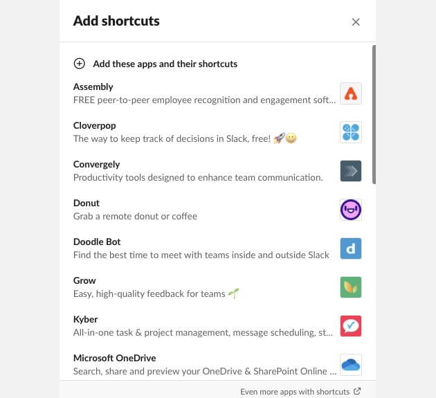 Você também pode adicionar atalhos de outros aplicativos usando o mesmo menu. Em “Adicionar atalhos de aplicativos”, escolha Obter mais aplicativos com atalhos e  escolha. Você será levado ao site do Slack para ler mais sobre o aplicativo e verá um botão: Clique em Adicionar ao Slack para finalizar a integração.