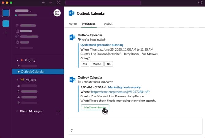 Conectar o Slack e sua agenda permite que você sincronize o Outlook ou o Google Agenda para, por exemplo, criar eventos no Slack, receber notificações no Slack quando uma chamada está prestes a começar ou permitir que sua agenda defina automaticamente o status do Slack para ser exibido você está em uma reunião.