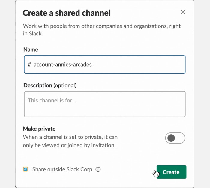 Comece criando um novo canal. No painel de navegação esquerdo do Slack, clique no + ao lado de “Canais”. Clique em Criar um canal. Nomeie o canal, insira uma breve descrição e indique se deseja que o canal seja privado. (Com um canal privado, cada membro individual deve ser convidado a ingressar nele; enquanto qualquer pessoa em qualquer organização membro pode acessar um canal público.)