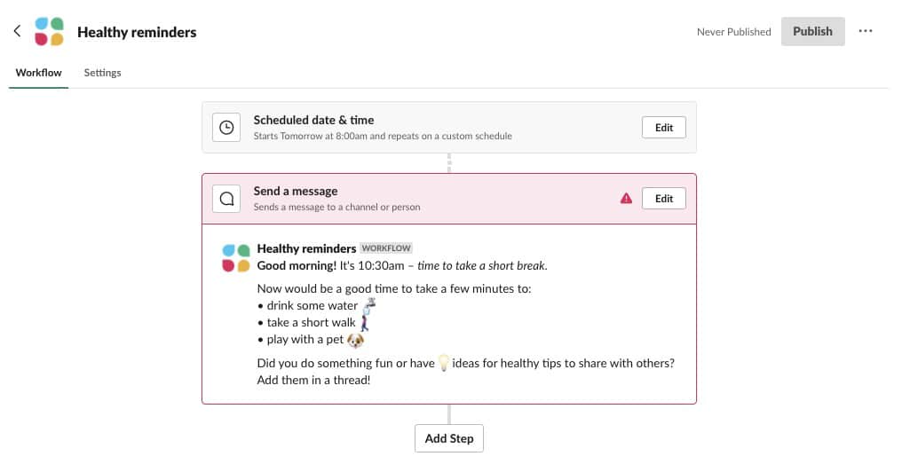 No Slack, clique no nome do seu espaço de trabalho e em Ferramentas> Construtor de fluxo de trabalho/Worflow Builder. Clique no botão Importar no canto superior direito e siga as instruções para instalá-lo. Você pode editar a hora, a data, a frequência e a mensagem e, em seguida, quando estiver pronto para cutucar automaticamente seus colegas de trabalho, clique em Publicar