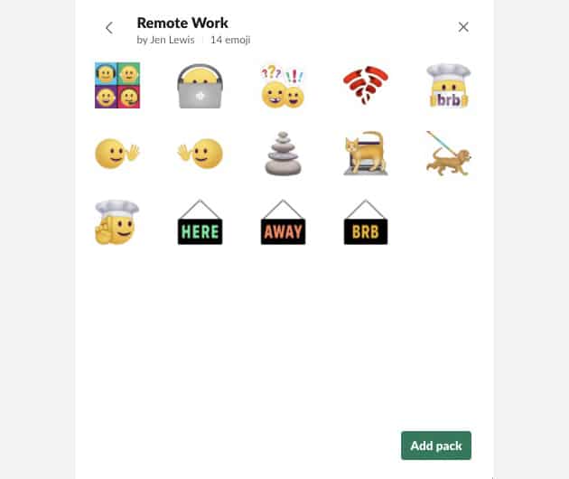 Em qualquer mensagem do Slack, clique no ícone Emoji e, em seguida, no botão Adicionar Emoji na parte inferior da janela de emoji. Procure o pacote de Trabalho Remoto e clique em Adicionar pack. A empresa diz que vai lançar novas coleções pré-fabricadas em breve.