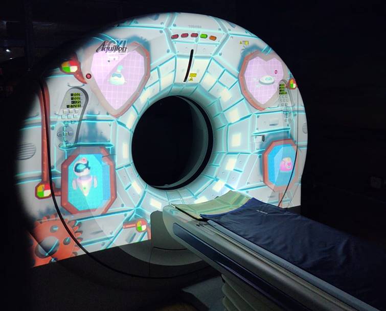 Na sala onde está o aparelho, imagens dos personagens são projetadas no tomógrafo e no teto. O paciente continua interagindo com o robô e seus ajudantes durante todo o procedimento, a fim de acalmar a criança e de fazê-la passar pelo aparelho de maneira tranquila.