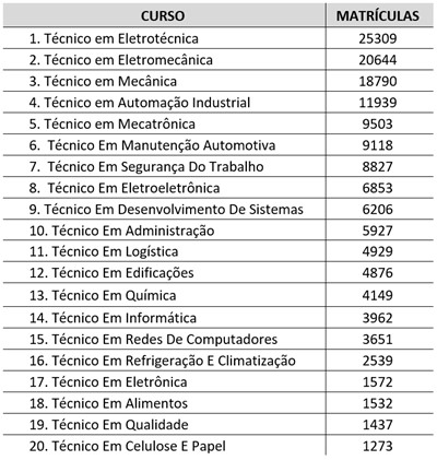 No total foram 166.786 matrículas em cursos técnicos e 223.133 em cursos de qualificação profissional voltados para as necessidades da indústria como um todo. O setor emprega 9,7 milhões de pessoas – ou 20,4% do total de empregos formais do país, segundo o Senai.